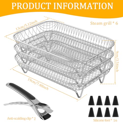 24 unidades de rack quadrado de fritadeira a ar com 2 clipes e 16 pés de silicone, 3 camadas, desidratador, empilhável, de aço inoxidável, 20 cm, acessórios...