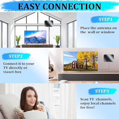 - 【Recepção de 360° 】 Antena para smart tv pode receber sinais de 360°. O cabo HDTV de 4,7 m de espessura pode funcionar muito bem em qualquer lugar, pode ser instalado nas paredes, janelas, armários, cenas ao ar livre, etc. A antena serve para casa, garagem subterrânea, empresa, churrascos ao ar livre, trailers, etc. Tente colocar a antena em diferentes posições para testar o sinal mais forte!