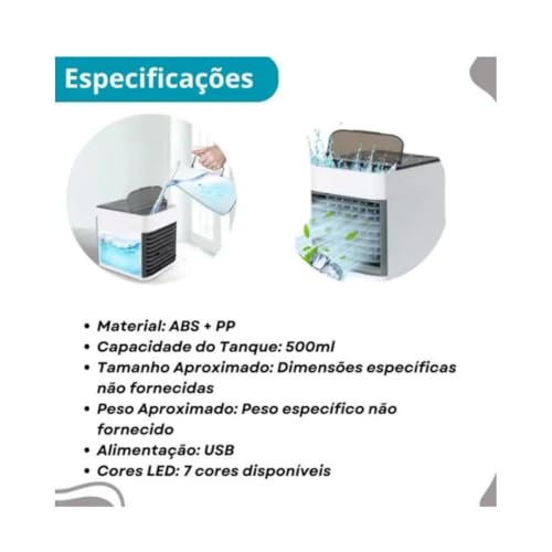 Especificação: Ar Condicionado Portátil 3 em 1 | Climatizador, Umidificador e Purificador de Ar USB | Silencioso e Econômico para Quarto e Escritório