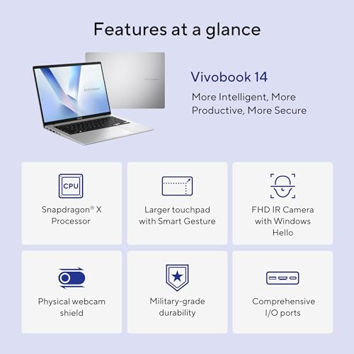 - Em amazon.com.br você pode comprar ASUS Laptop Vivobook 14, tela WUXGA 60Hz de 14 polegadas, Qualcomm Snapdragon X, GPU Qualcomm Adreno, RAM de 16 GB, SSD de 512 GB, Windows 11, Cool Silver, X1407QA-BS56 por apenas R$ 5.628,78