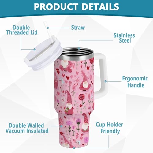 Especificação: Boccsty Copo com isolamento de corações de gnomo rosa para Dia dos Namorados, copo reutilizável de aço inoxidável, copo de 1,134 g, caneca de viagem, garrafa de água com alça e canudo dobrável para