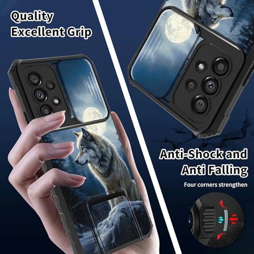 Especificação: BREIDMKFM Capa para celular Galaxy A23 5G com protetor de tela e suporte e capa de lente de câmera deslizante capa resistente de camada dupla resistente para Samsung A23 5G/4G, lobo fofo lua