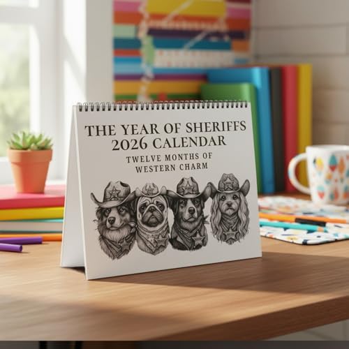 - Design com Charme Western: Com um motivo de cão xerife presente ao longo dos doze meses, o calendário de parede 2026 cativa os amantes de animais com ilustrações a preto e branco marcantes. Confere um caráter distinto ao planeamento diário, sendo um delicioso para cozinhas, escritórios ou salas de estar.