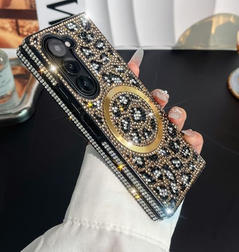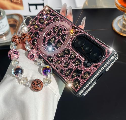 Capa para Samsung Galaxy Z Fold 6 Bling [compatível com MagSafe] Capa de telefone magnética fina com estampa de leopardo com pulseira de cristal, ouro