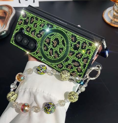 Especificação: Capa para Samsung Galaxy Z Fold 6 Bling [compatível com MagSafe] Capa de telefone magnética fina com estampa de leopardo com pulseira de cristal, ouro