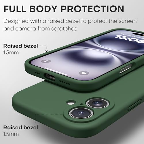 Especificação: CellEver Capa de silicone resistente para iPhone 16 [proteção da câmera] [revestimento antióleo] proteção militar contra quedas, interior macio sem arranhões, verde floresta