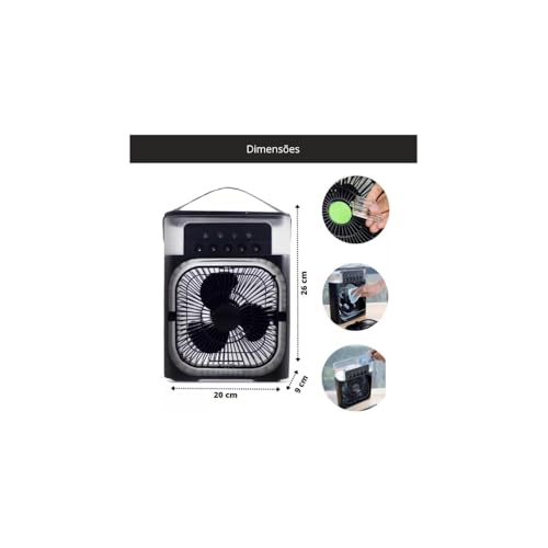 Climatizador e Ventilador Portátil LED, Preto, 10W, 500ml, com 3 Velocidades, Silencioso, 15,8×7,5x23cm, Bivolt
