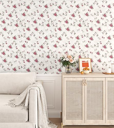 EPPKILY Papel de parede floral rosa vermelho descasque e cole papel de parede floral vintage para paredes de quarto de berçário 44,5 x 259,1 cm Papel de...