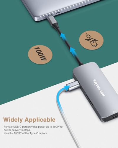- [Hub USB C de 7 em um] Conecte aos dispositivos MacBook Pro ou USB-C mais recentes com o hub USB-C multiportas com uma porta de carregamento USB C com entrega de energia, uma porta HDMI 4K/30Hz, um leitor de cartão SD, um leitor de cartão TF e 3 portas USB 3.0, permitindo que você conecte um teclado, mouse, driver USB ou disco externo ao MacBook Pro. Este hub USB C se aplica a todos os laptops tipo C.