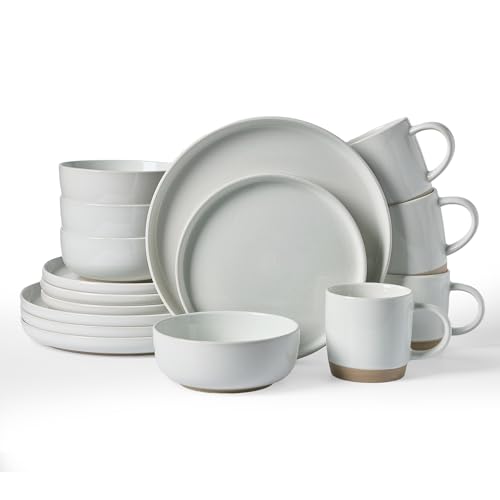 Especificação: Famiware Conjunto de louça Milkyway com canecas, serviço para 4 (16 peças), conjuntos de pratos e tigelas de grés canelados, resistente a lascas e arranhões, seguro para micro-ondas e lava-louças