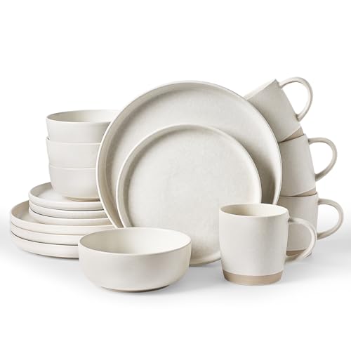 Famiware Conjuntos de louça de grés Milkyway com canecas, serviço para 4 (16 peças), conjuntos de pratos e tigelas de esmalte reativo, conjunto de pratos para micro-ondas e lava-louças, bege fosco
