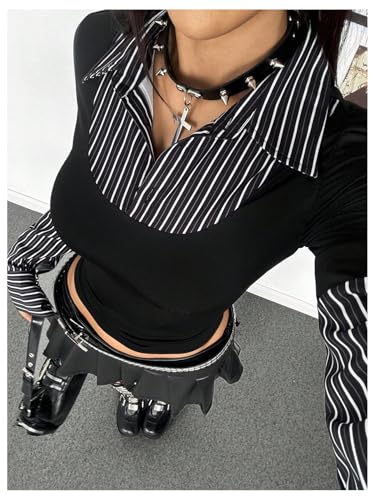 Especificação: Floerns Blusa feminina listrada 2 em 1 de manga comprida com botões para sair de outono, Preto e branco, M