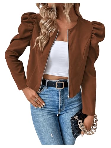Floerns Jaqueta feminina elegante de manga bufante com zíper e gola redonda, Marrom, G