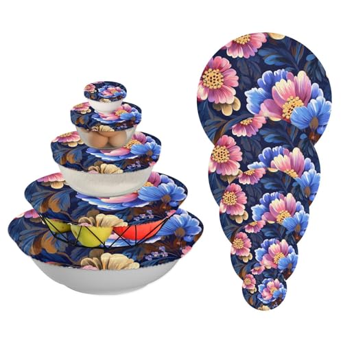 Flores retrô com sensação de pintura a óleo colorida, 5 peças, capas elásticas reutilizáveis em 5 tamanhos, tampas de pão para geladeira, acampamento e cozinha