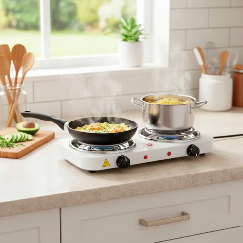 - DESIGN VERSÁTIL: Fogão elétrico portátil com 2 bocas, ideal para uso doméstico, camping e viagens, com dimensões compactas de 45x22x7 cm