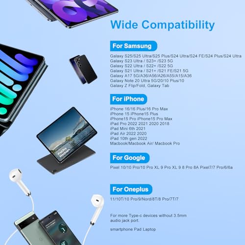 - Compatibilidade de fones de ouvido com fio USB C: fones de ouvido USB C com fio são para iPhone 17/17 Pro/17 Pro Max, iPhone Air 2025,16e,16, iPhone 16 Plus, iPhone 16 Pro Max, iPhone 15, iPhone 15 Plus, iPhone 15 Pro, iPhone 15 Pro Max, Samsung Galaxy S25 Ultra/S24 Ultra FE/S24 Plus/. S23 Ultra. a/S23+/S23/S22/S21/A17 5G/A36/A56/A16/A15/A14/A13 Z Flip 7 6/Z Fold 7 6, Google Pixel 10/10 Pro XL/10 Pro/9 Pro XL/9 Pro Fold/9/8a/8 Pro/8/7a/7 Pro/7 Pro/7 /6a/6 Pro/6/5a/5/4a/4/Moto Edge/Razr/Razr+ 2025/G Power/G Pure/G Stylus/G Play, a maioria dos telefones tipo C e mais dispositivos USB-C.