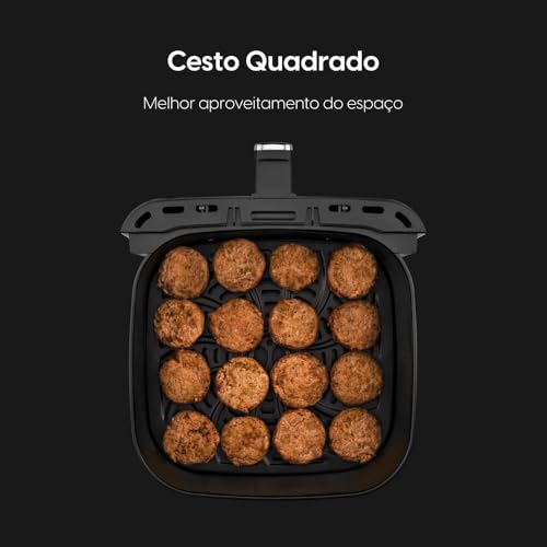 Fritadeira sem óleo com capacidade para 8 litros e 1750 Watts de potência; Controle de temperatura de 80°c a 200°c e temporizador ajustável de até 60 minutos com aviso sonoro; Fácil Limpeza: Grelha Removível com tripla camada, base antiderrapante; Segurança: Proteção contra superaquecimento, desligamento automático e alça fria para manuseio.