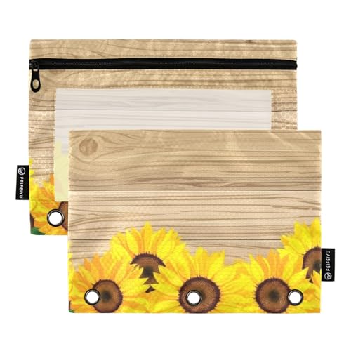 GAIGEO Bolsa de lápis rosa com 3 argolas de girassóis amarelos rústicos com zíper para fichário estojo de lápis de fichário transparente caneta escolar 25 cm x 18 cm, 2 pacotes