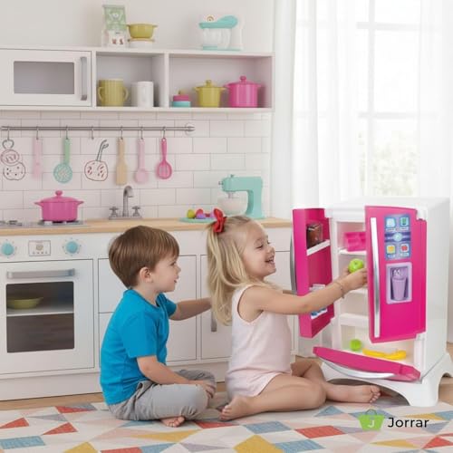 - DESIGN MODERNO: Geladeira duplex em cor rosa vibrante com dispenser de água e prateleiras internas, perfeita para brincadeiras de casinha criativas e realistas