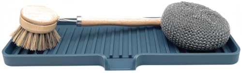 Happitasa Bandeja de saboneteira de silicone e suporte de esponja com calha de drenagem | Organizador de pia de banheiro e cozinha (azul moky, 30 x 10 cm, 209 g)