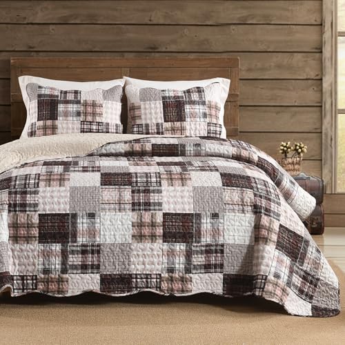 HORIMOTE HOM Conjunto de colcha de cabana rústica, tamanho Queen, 3 peças, reversível, estilo country, xadrez, patchwork, com 2 fronhas, microfibra macia para todas as estações