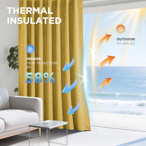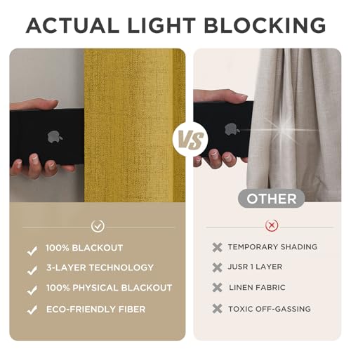 Joydeco Cortinas blackout 100% para quarto – Cortinas de linho natural 132 cm L x 183 cm C de comprimento, isolamento térmico 2 painéis cortinas com bloqueio de luz amarela, bolso para varão e abas