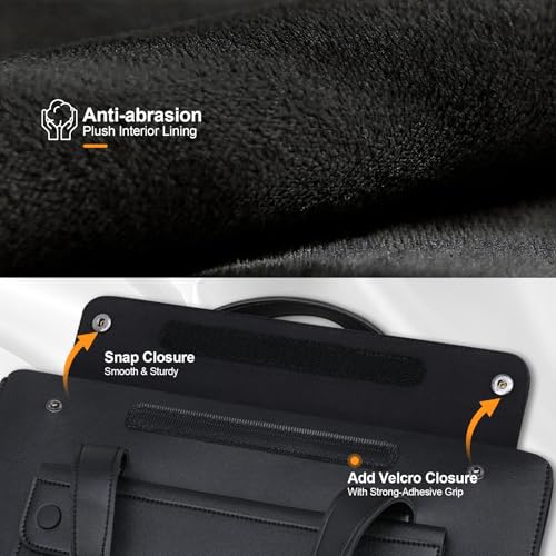 - Construção Resistente e Costura Reforçada: O forro felpudo resistente a riscos protege os ecrãs e dispositivos contra danos, enquanto o exterior em couro preto repelente à água resiste ao desgaste e a derrames. Reforçada com costuras triplas nas alças para transporte pesado. Combina luxo e durabilidade numa bolsa de couro para computador portátil que protege com estilo.