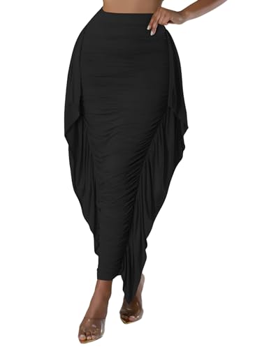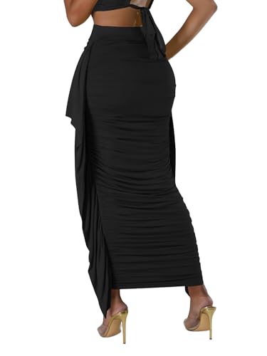 MAYFASEY Saias lápis longas femininas de cintura alta franzidas ao corpo com babados laterais e franjas, Preto, M