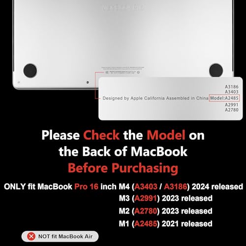 - Verifique o modelo para MacBook: a capa foi projetada para MacBook Pro de 16 polegadas, lançado em 2024, 2023 e 2021. Apenas modelo compatível: A3403/A3186/A2991/A2780/A2485 M4/M3/M2/M1 Pro/Max com Touch ID e tela retina. Verifique o modelo específico “AXXXX” na parte traseira do seu MacBook antes de comprar