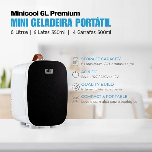 Design Minicool Porta com acabamento em vidro Bivolt ( 110 – 220 volts ) Fechamento magnético Alça em couro ecológico