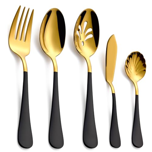 Moxinox Conjunto de 10 peças de talheres pretos e dourados, cabo colorido de aço inoxidável 18/0, inclui garfo de servir, colher de servir sólida e...