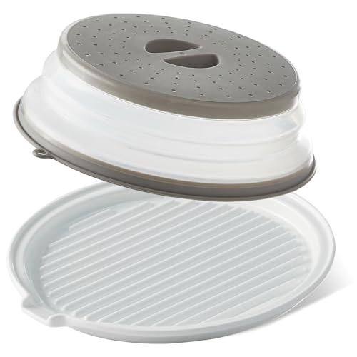 ONEMORE Bandeja de bacon de micro-ondas com tampa de cerâmica para cozinhar no forno, máquina de bacon crocante com tampa – Prato de bacon redondo de 28 cm, branco