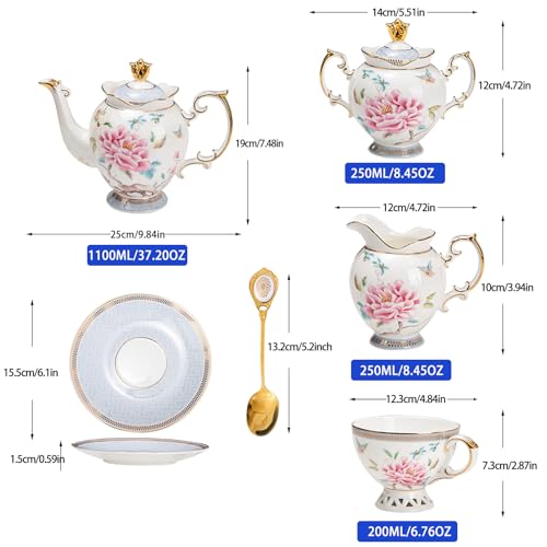 - Conjunto completo de chá inglês de 21 peças para adultos: este conjunto de chá de porcelana para adultos é perfeitamente configurado para 6 convidados, incluindo 1 bule de chá, 1 tigela de açúcar (com tampa), 1 creme, 6 xícaras de chá, 6 pires e 6 colheres. Tudo o que você precisa para organizar uma elegante festa de chá da tarde está aqui em um conjunto de chá de porcelana pronto para presente
