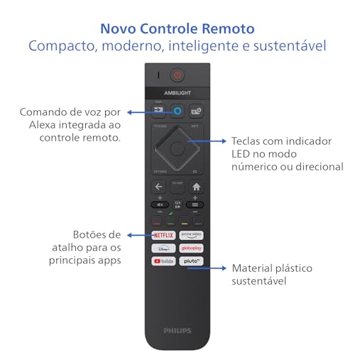 - EXPERIÊNCIA AMBILIGHT. Luzes inteligentes de três lados que se sincronizam com o conteúdo na tela, expandindo a imagem para além do display e criando uma experiência visual única.