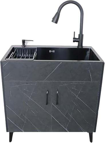 Especificação: Pia De Aço Inoxidável Com Armário De Armazenamento, Armário De Pia Independente Com Torneira Extraível, Estação De Lavagem De Mãos Espaçosa Adequada Para Despensa, Co, Black, 58 * 43CM/22.8 * 16.9IN