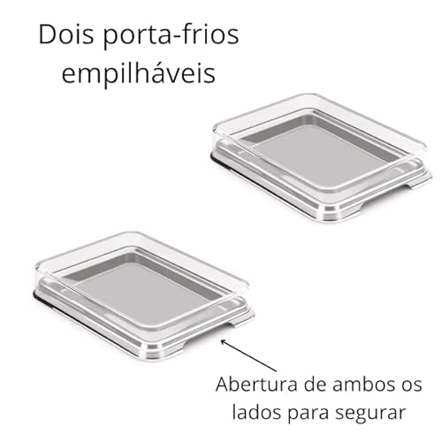 Especificação: Porta Frios Duplo Aço Inox Tampa de Acrílico Transparente Empilhável com Pinça Moderna