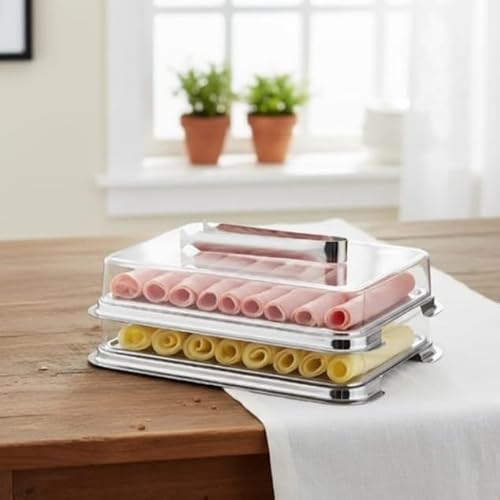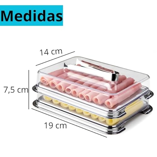 - DESIGN DUPLO: Porta-frios com dois compartimentos empilháveis em aço inoxidável, perfeito para organizar e servir diferentes tipos de frios