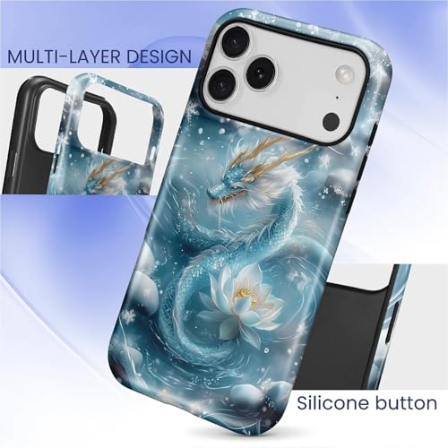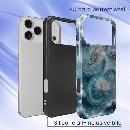 Especificação: Punmada Capa para iPhone 17 Pro Max, capa híbrida rígida de silicone à prova de choque para iPhone 17 Pro Max, azul floco de neve, estampa de dragão de lótus