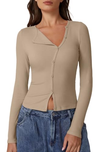QINSEN Camisetas femininas de manga longa canelada gola redonda com fecho de botão superior, Caqui, G