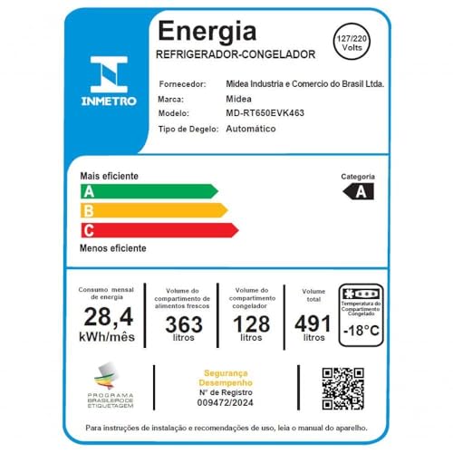 - Capacidade total: 491 litros Capacidade do Refrigerador: 363 Litros Capacidade do Freezer: 128 Litros