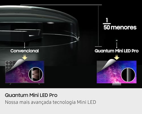 • Cada detalhe ganha vida com o poder do Mini LED. Mini LEDs Pro Samsung. A imagem ganha mais detalhes com 40 Mini LEDs que substituem cada LED convencional, entregando brilho mais intenso, contraste profundo e cores mais vibrantes.