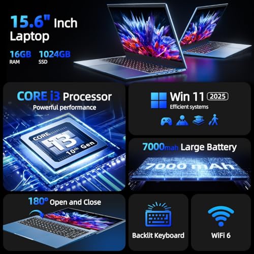 SGIN Laptop de 15,6 polegadas, laptops Win 11 com 16 GB de RAM, SSD de 1024 GB, CPU Core i3 (até 3,9 GHz), teclado retroiluminado, bateria de 53,2 Wh, WiFi...