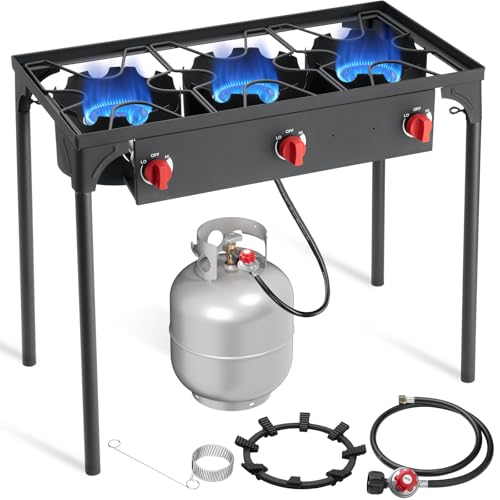 - Material premium resistente: este fogão a propano de 3 bocas possui um acabamento revestido em pó resistente às intempéries e construção de ferro reforçado, proporcionando durabilidade incomparável para fogões de cozinha ao ar livre. Construído para suportar uso robusto.