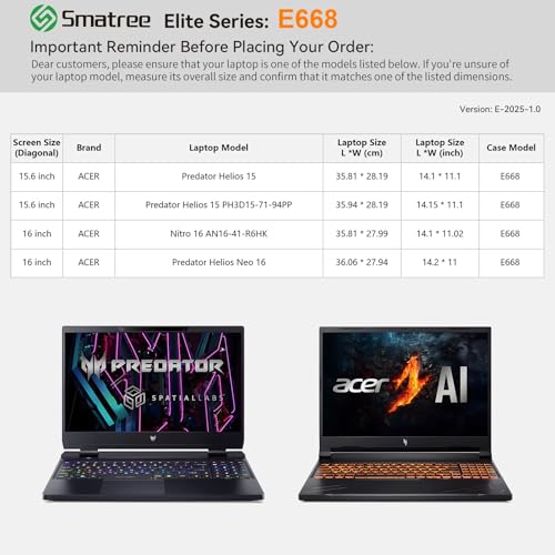 Especificação: Smatree Capa para laptop de 15,6 polegadas Acer Predator Helios 3D 15 PH3D15-71-94PP, para laptop gamer Nitro 16 AN16-41-R6HK/Predator Helios Neo 16 de 16 polegadas, zíper YKK, design patenteado à