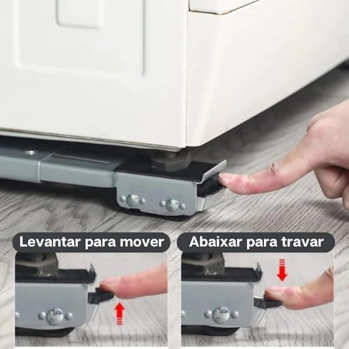 - Basta levantar levemente o eletrodoméstico (com cuidado), encaixar as bases móveis sob os pés ou base do equipamento e baixá-lo. Pronto! Seu eletrodoméstico agora é móvel, sem necessidade de parafusos ou instalação complexa.