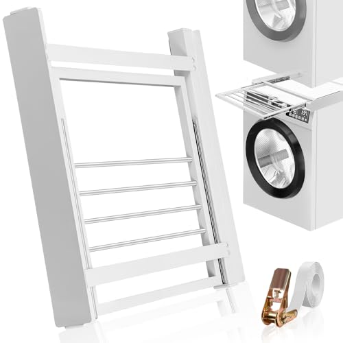 - 【Design exclusivo do varal retrátil】 O kit empilhável para máquina de lavar e secar roupa possui um varal retrátil no centro, com capacidade para suportar até 5 kg. É prático para secar toalhas e roupas, além de poder ser usado para guardar grandes frascos de detergente, facilitando o acesso e economizando espaço, para uma utilização mais prática.