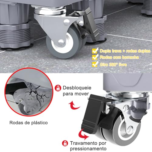 - 【Base Resistente】Base móvel para máquina de lavar com 4 rodas bloqueáveis e 8 pés antivibração reforçados – Almofadas de borracha antiderrapantes na base + 4 almofadas superiores removíveis. Estrutura em metal duplo para carga pesada e movimentação suave, suporte inox com rodízios.