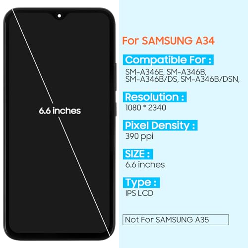 - Em amazon.com.br você pode comprar Tela de substituição para Samsung Galaxy A34 5G para Samsung A34 5G A346 LCD A346E A346B A346M Digitalizador Touch Screen Montagem completa com ferramentas de reparo (preto com moldura, sem impressão por apenas R$ 199,47